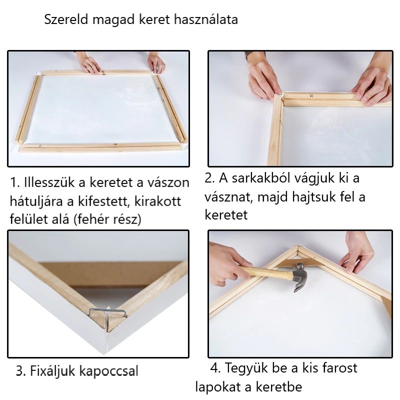 A négy kis farostlemezből készült, sréhen vágott fa alkatrésszel pedig ki tudjuk támasztani a keretek sarkát, ezeket az alkatrészeket nyomjuk a keretben található kis résbe, hogy tartsa a keretünket.